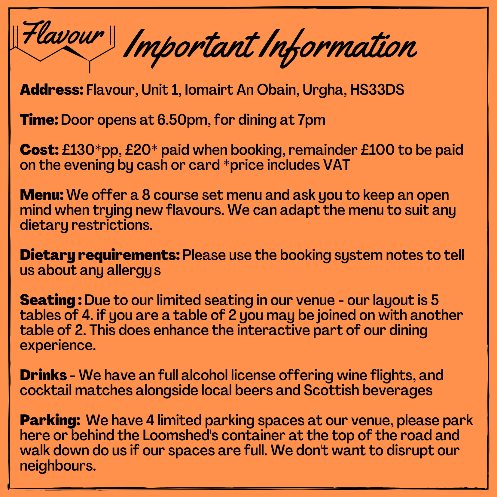 Cancelation list – If you are unlucky and the dates you’d like to dine with us are fully booked/ unavailable on our calendar please send us an email at Flavour.scot@gmail.com and we can add you to our waiting list.